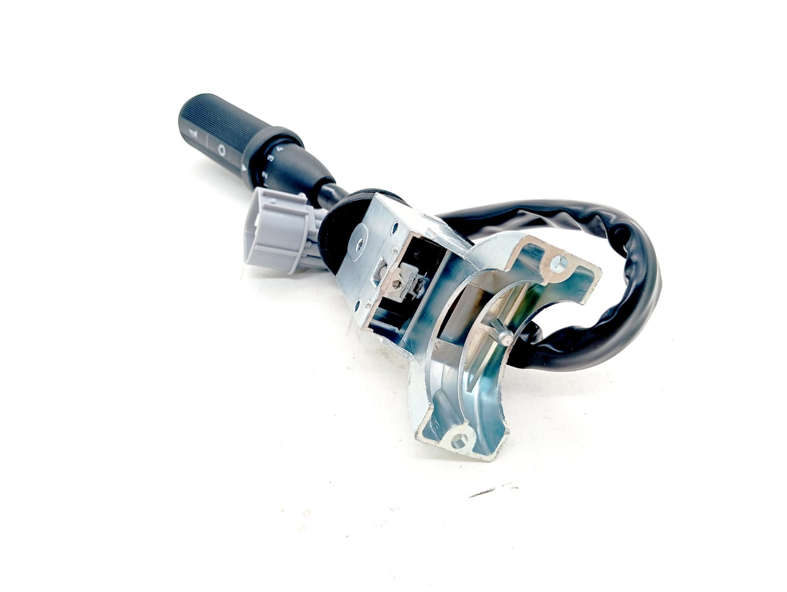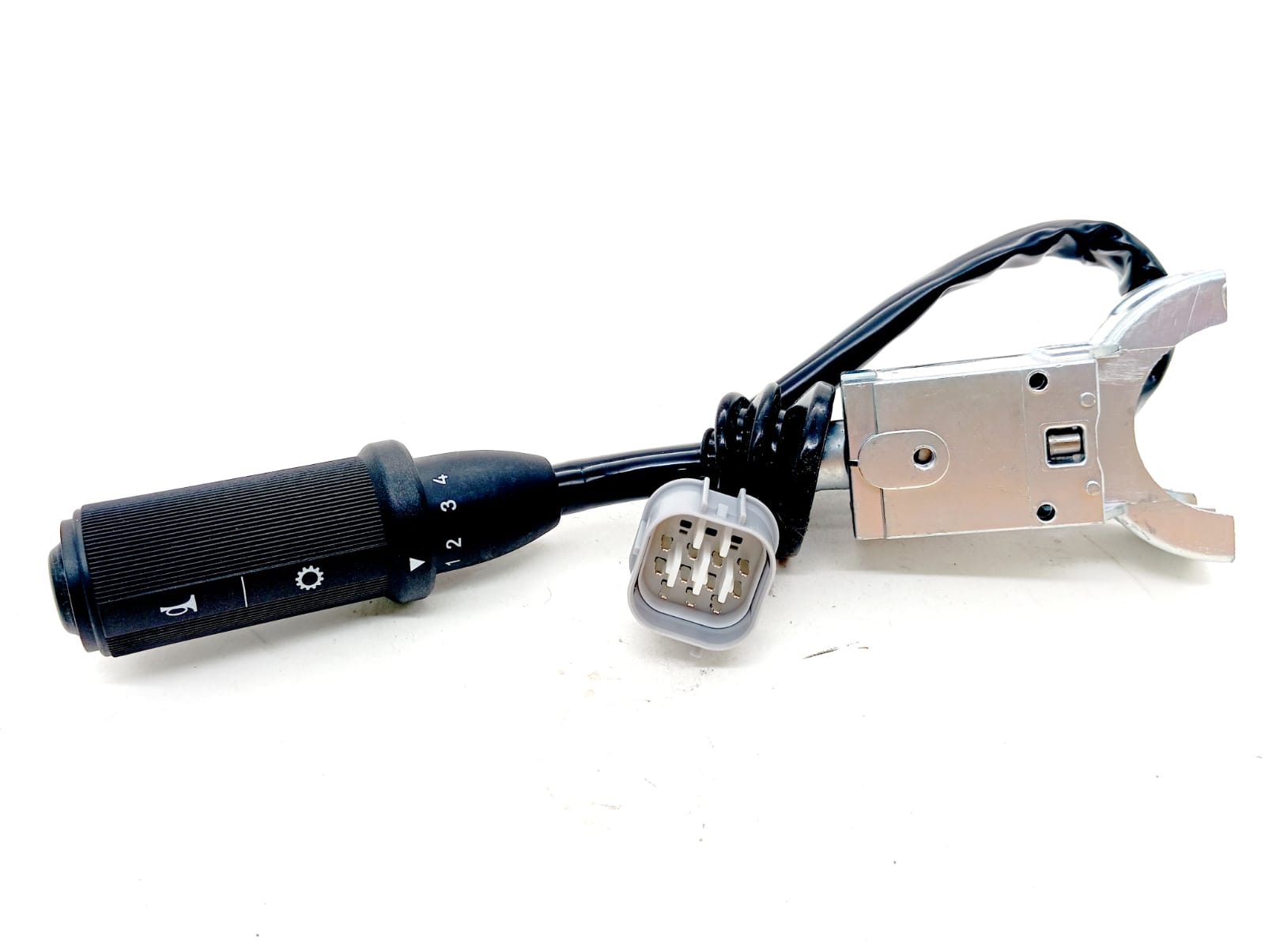 Подрулевой переключатель JCB расположен с левой стороны от рулевого колеса JCB предназначен для включения передач КПП (4-х ступенчатый автомат powershift), путем выбора передачи и направления на переключателе сигнал с переключателя подается на соленоиды (электро-магнитный клапан) распределителя КПП JCB. Переключатель имеет положения вверх>движение вперед, вниз>движение назад и торцевую клавишу подачи звукового сигнала JCB. Выбор передач 1;2;3;4 выполняется рычагом переключения в кабине